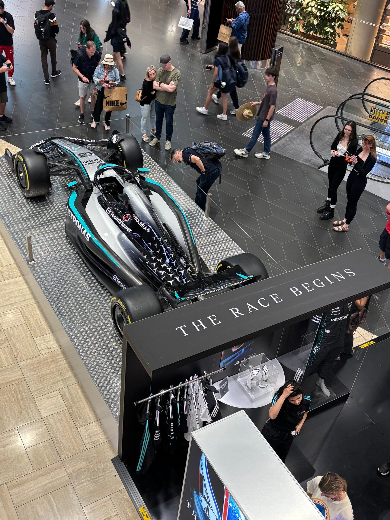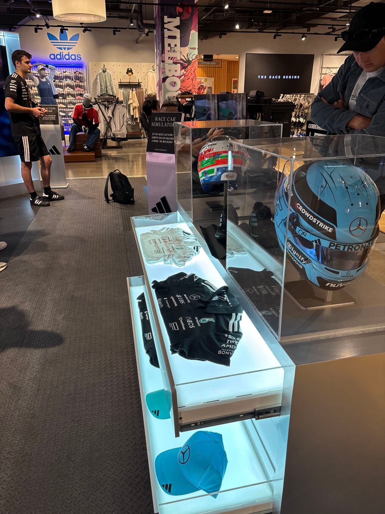 I stumbled upon the activation Mercedes and Adidas held at the Emporium shopping centre by chance while shopping early in the week. It featured a show car, team wear, and a pit wall simulator on one floor, and a racing simulator, some helmets, and additional merch and team wear in the actual shop.