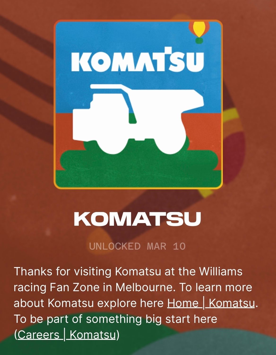 I want to give a big shoutout to Komatsu for the way that they engage at the fan zone. Komatsu are not a D2C brand, and a company that makes heavy machinery is not the kind of company you would usually think about when considering fan engagement activations. However, they have very cleverly narrowed their focus to employment growth, and as you can see in the badge above, their primary activity is encourage fans to check out their careers page. They are such a good example of thinking outside of the square when it comes to leveraging their sponsorship and activating an engagement with fans in a non-traditional way. (They also had a very cool digger simulator, however, it had a line so long each time I was there I wasn’t able to actually give it a go!)