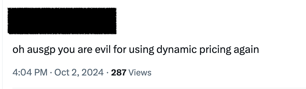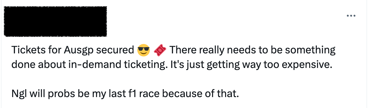 People often blame Ticketmaster for dynamic pricing, and while it is their model and they are overall a pretty evil company, we need to remember that it is the individual event and organisers that choose to turn dynamic pricing on. The Australian Grand Prix Corporation could have been content with just their annual ticket price hike, and look, I’ll even let them keep the $200 pre-sale access. But dynamic pricing? That’s not something we should let them get away with.